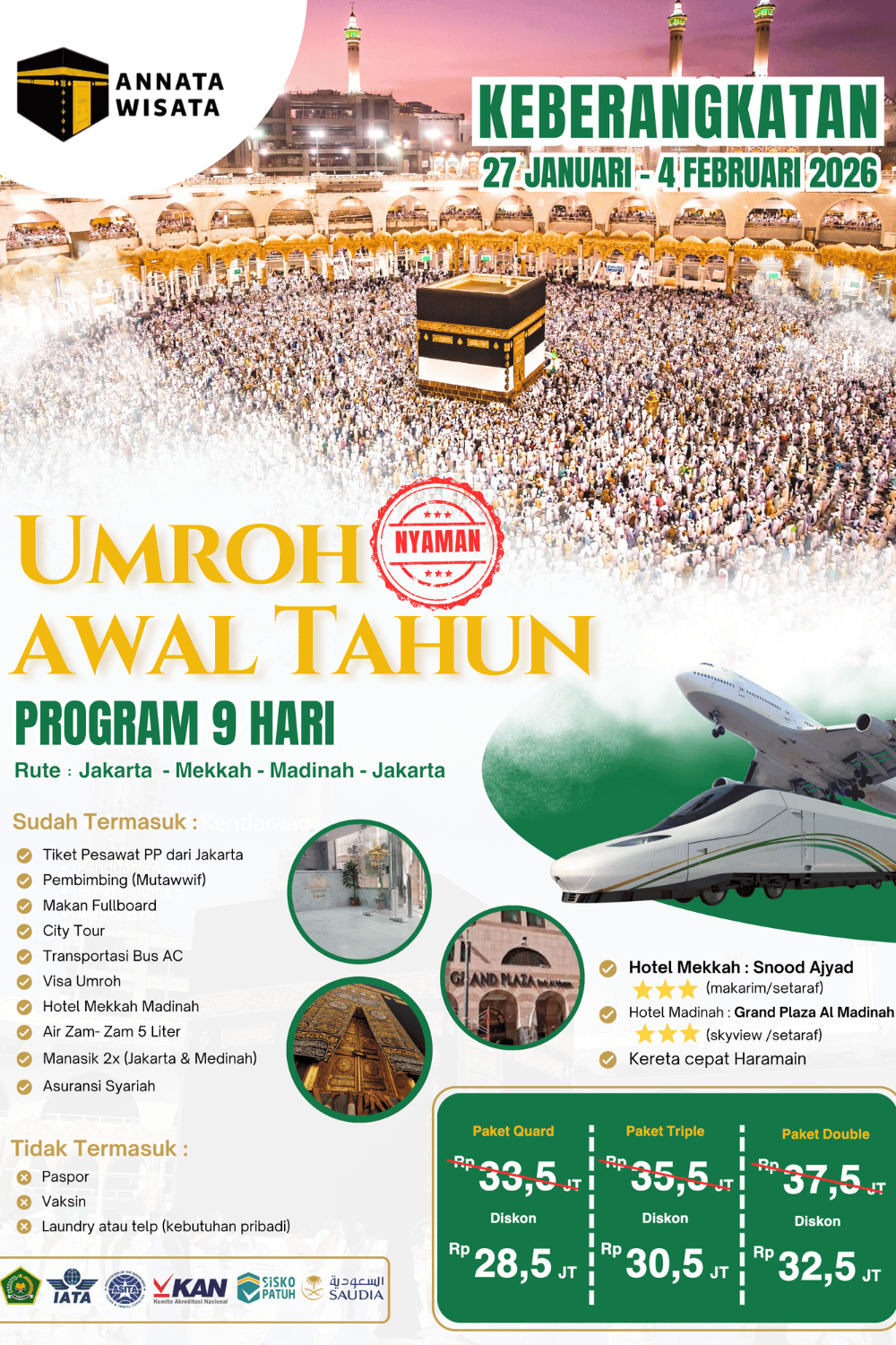 Tersedia penerbangan langsung tanpa transit, membuat perjalanan umroh lebih cepat, efisien, dan nyaman bagi jamaah Annata Wisata.